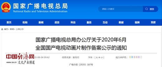 經濟日報-中國經濟網北京8月5日訊 中國經濟網文化產業(yè)頻道記者從國家廣播電視總局官網獲悉,《國家廣播電視總局辦公廳關于2020年6月全國國產電視動畫片制作備案公示的通知》(簡稱《通知》)于4日發(fā)布。《通知》明確,2020年6月,經備案公示的全國國產電視動畫片為53部,19934分鐘。