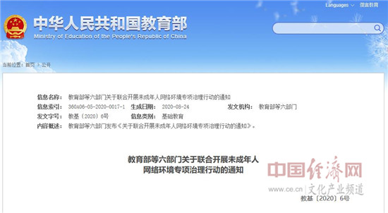 教育部等六部門關(guān)于聯(lián)合開展未成年人網(wǎng)絡(luò)環(huán)境專項治理行動的通知