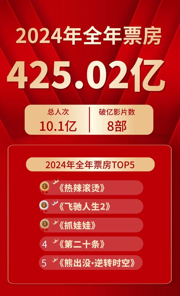 據(jù)貓眼專業(yè)版數(shù)據(jù),2024年全年共有8部影片破10億,年度票房冠軍為春節(jié)檔影片《熱辣滾燙》,全年大盤占比為8.1%。年度TOP10影片分別為《熱辣滾燙》《飛馳人生2》《抓娃娃》《第二十條》《熊出沒·逆轉(zhuǎn)時(shí)空》《默殺》《志愿軍:存亡之戰(zhàn)》《年會(huì)不能停!》《哥斯拉大戰(zhàn)金剛2:帝國崛起》《你想活出怎樣的人生》,其中,國產(chǎn)片占據(jù)八席,進(jìn)口片占據(jù)兩席,涵蓋類型包括喜劇、劇情、犯罪、戰(zhàn)爭、動(dòng)作、動(dòng)畫等。整體看來,2024年電影市場仍呈現(xiàn)出較強(qiáng)的韌性和上升空間。