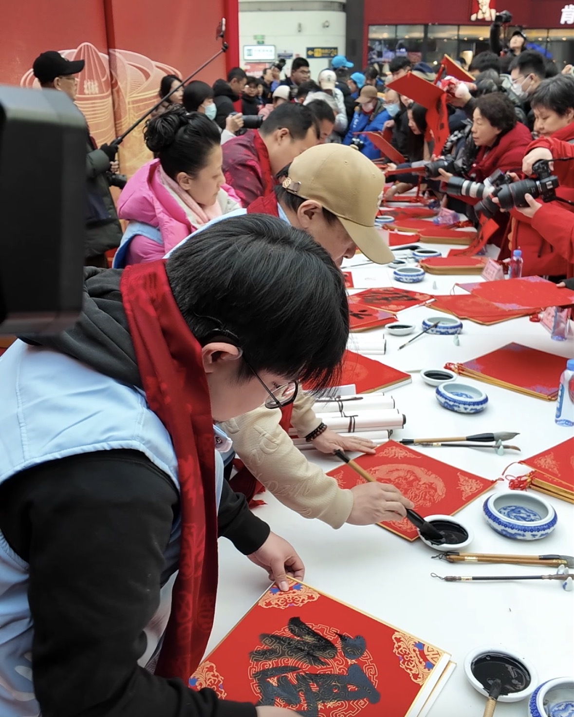 “旅途賀新春、溫暖回家路”春運(yùn)送溫暖文明實踐活動在北京南站候車大廳上演。書法家們?yōu)槁每蜁鴮懜W?。中國?jīng)濟(jì)網(wǎng)記者鞠然/攝