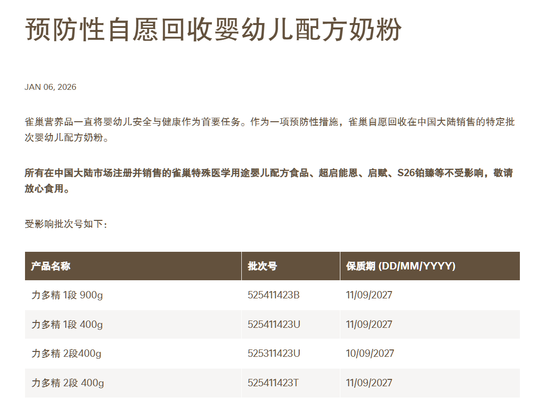 1月6日,雀巢大中華區(qū)官方網(wǎng)站發(fā)布兩則《預(yù)防性自愿回收嬰幼兒配方奶粉》公告。一份公告針對(duì)在中國大陸銷售的特定批次嬰幼兒配方奶粉,涉及力多精、鉑初能恩、舒宜能恩以及惠氏膳兒加兒童成長(zhǎng)奶粉等30批次產(chǎn)品。另一份公告則針對(duì)所有此次涉事的進(jìn)口自歐洲、在中國大陸跨境電商渠道銷售的嬰幼兒配方奶粉,涉及“Nestlé BEBA Supreme”“惠氏Wyeth啟賦未來”等41批次產(chǎn)品。