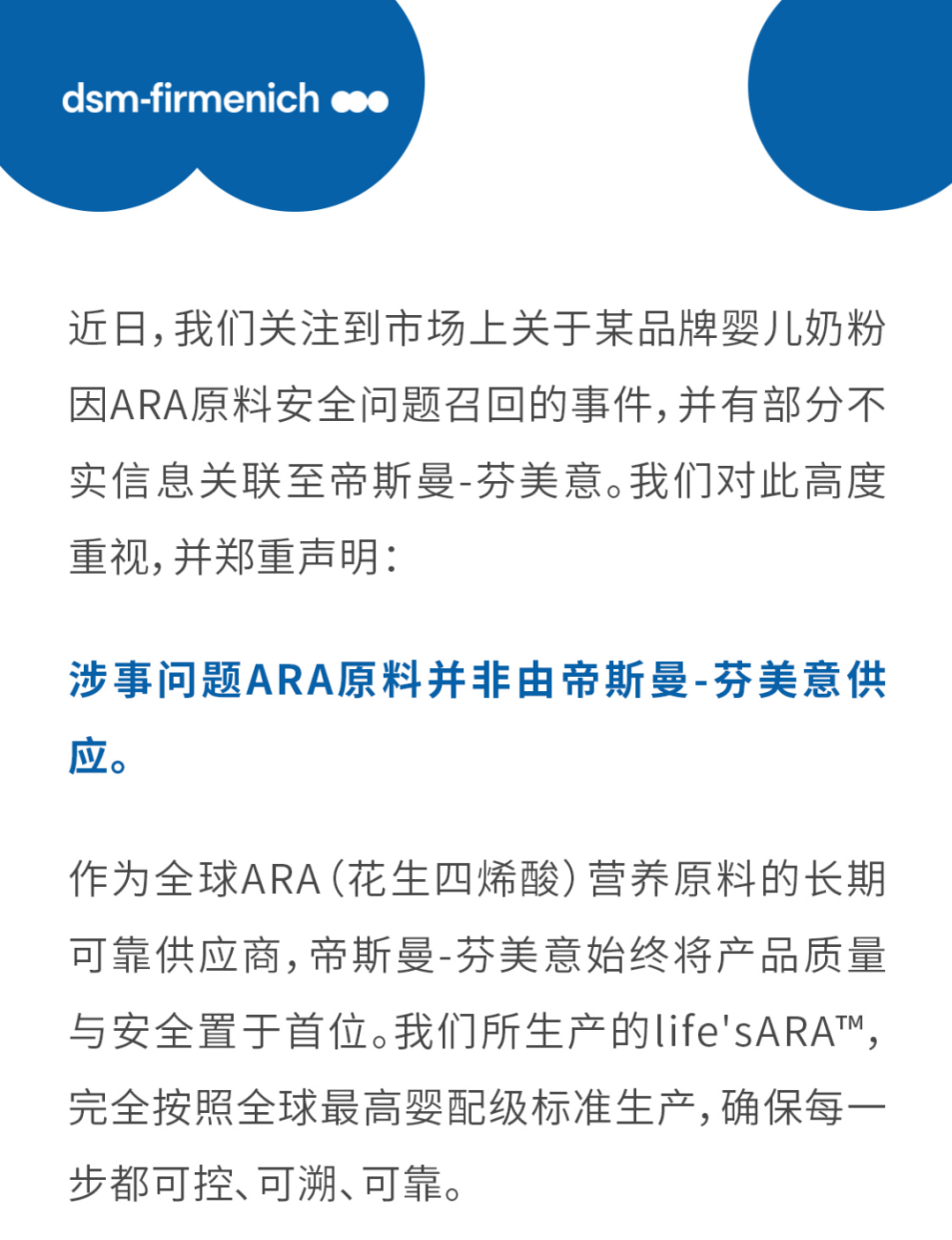 帝斯曼-芬美意人類營養(yǎng)與關(guān)愛事業(yè)部的官方公眾號(hào)“帝斯曼芬美意營養(yǎng)365”發(fā)布聲明《嚴(yán)正聲明:近日涉事問題ARA原料并非由帝斯曼-芬美意供應(yīng)》的截圖。