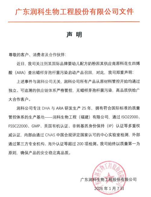 同日,廣東潤(rùn)科生物工程股份有限公司也發(fā)布聲明稱,召回事件與潤(rùn)科公司無關(guān),潤(rùn)科公司所有產(chǎn)品從原材料管控開始均通過獨(dú)立、可追溯的供應(yīng)鏈體系嚴(yán)格管控,無蠟樣芽孢桿菌污染。