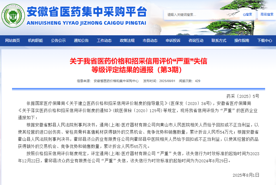 通報(bào)顯示,根據(jù)安徽省黟縣人民法院刑事判決書,通用(上海)醫(yī)療器材有限公司向黃山市人民醫(yī)院相關(guān)人員給予回扣或不正當(dāng)利益,以使其經(jīng)營的進(jìn)口創(chuàng)傷類、脊柱類骨科高值耗材獲得額外的交易機(jī)會(huì)、競爭優(yōu)勢和銷售數(shù)量,累計(jì)折合人民幣54萬元;按照價(jià)格招采信用評(píng)價(jià)制度規(guī)定,評(píng)定通用(上海)醫(yī)療器材有限公司“嚴(yán)重”失信,該失信行為時(shí)效標(biāo)準(zhǔn)的起始時(shí)間為2023年12月22日。