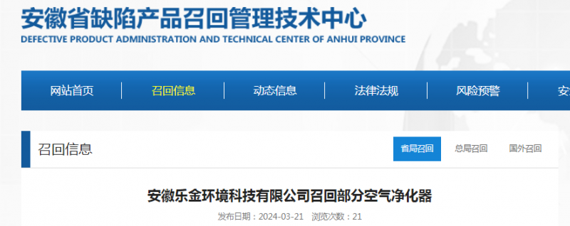 日前,安徽樂金環(huán)境科技有限公司按照《消費(fèi)品召回管理暫行規(guī)定》的要求,向安徽省市場(chǎng)監(jiān)督管理局、蕪湖市市場(chǎng)監(jiān)督管理局報(bào)告了召回計(jì)劃,將自即日起,召回2023年3月6日生產(chǎn)的空氣凈化器(規(guī)格型號(hào)為KJ700F-P70 72W),涉及數(shù)量為28臺(tái)。
