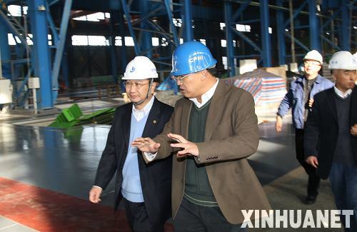 在一重新建成的重型加工熱處理車間,吳生富(戴藍(lán)帽者)向來訪的中廣核工程公司總經(jīng)理束國剛一行介紹一重在制核電產(chǎn)品情況(2009年10月28日攝)。新華社發(fā)(陳建軍攝)